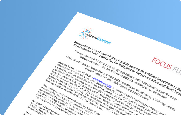 ImmunoGenesis and Cancer Focus Fund Announce $4.5 Million Investment to Support First-in-Human Trial of IMGS-001 for Relapsed or Refractory Advanced Solid Tumors