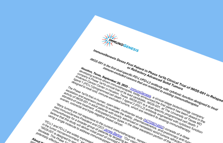 ImmunoGenesis Doses First Patient in Phase 1a/1b Clinical Trial of IMGS‑001 in Relapsed or Refractory Advanced Solid Tumors