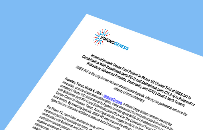 ImmunoGenesis Doses First Patient in Phase 1/2 Clinical Trial of IMGS-101 in Combination With Balstilimab (anti-PD-1) and Zalifrelimab (anti-CTLA-4) in Relapsed or Refractory Advanced Prostate, Pancreatic, and HPV(-) Head & Neck Tumors