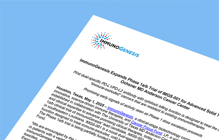 ImmunoGenesis Expands Phase 1a/b Trial of IMGS-001 for Advanced Solid Tumors to Ochsner MD Anderson Cancer Center