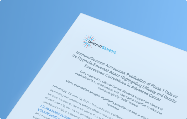 ImmunoGenesis Announces Publication of Phase 1 Data on its Hypoxia-Reversal Agent Highlighting Efficacy and Genetic Expression Correlatives in Advanced Cancer
