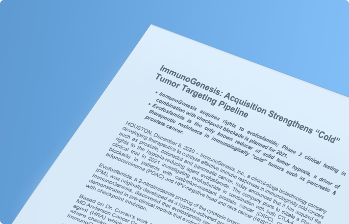 • ImmunoGenesis acquires rights to evofosfamide; Phase 2 clinical testing in combination with checkpoint blockade is planned for 2021.