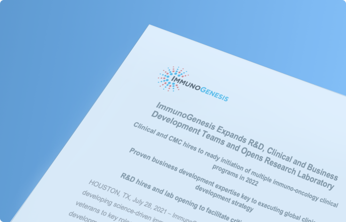 ImmunoGenesis announces the appointment of seasoned industry veterans to key roles to support the expansion of the company’s R&D, clinical and business development activities. ImmunoGenesis also announces the opening of a research laboratory in JLABS @ TMC to facilitate critical translational research for its drug development programs.