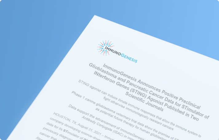 ImmunoGenesis Announces Positive Preclinical Glioblastoma and Pancreatic Cancer Data for STimulator of INterferon Genes (STING) Agonist Published in Two Scientific Journals