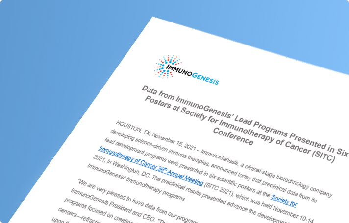 Data from ImmunoGenesis’ Lead Programs to be Presented at Society for Immunotherapy of Cancer (SITC) Conference