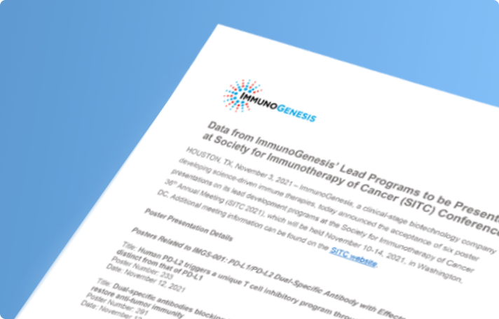 ImmunoGenesis announces the acceptance of six poster presentations on its lead development programs at the Society for Immunotherapy of Cancer 36th Annual Meeting (SITC 2021).