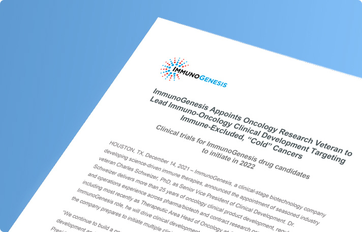 ImmunoGenesis Appoints Oncology Research Veteran to Lead Immuno-Oncology Clinical Development Targeting Immune-Excluded, “Cold” Cancers