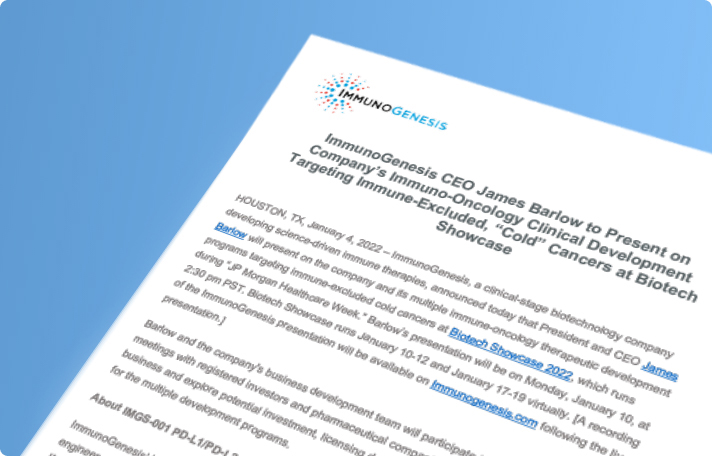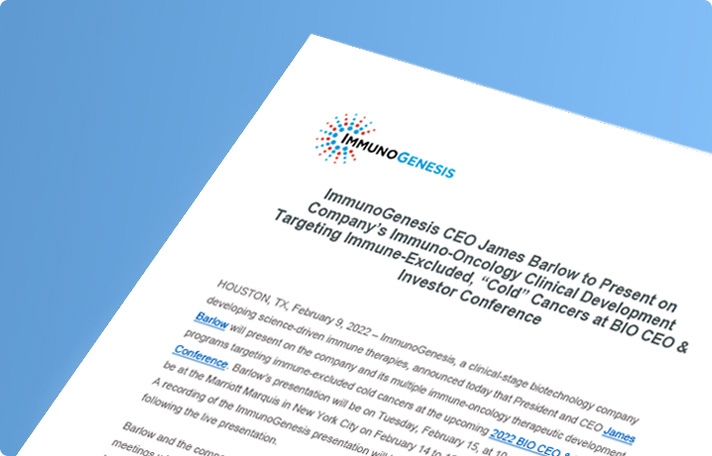 ImmunoGenesis announces that President and CEO James Barlow will present on the company and its multiple immune-oncology therapeutic development programs targeting immune-excluded cold cancers at the upcoming 2022 BIO CEO & Investor Conference.