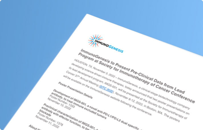 ImmunoGenesis announces that two poster presentations on its lead development program, IMGS-001, will be presented at the Society for Immunotherapy of Cancer 37th Annual Meeting (SITC 2022), November 8-12, 2022, in Boston, MA. The posters will be available on the ImmunoGenesis website following the conference.