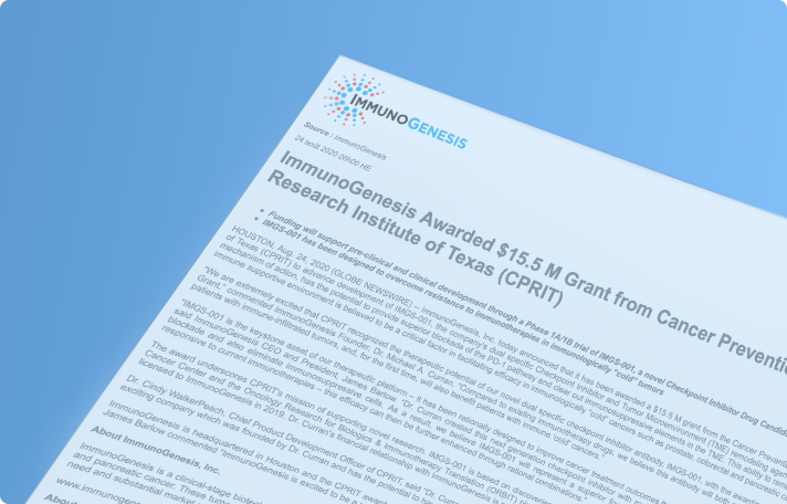 Announcing a $15.5 million grant from Cancer Prevention and Research Institute of Texas (CPRIT) to advance our development of IMGS-001, the dual-specific checkpoint inhibitor and tumor microenvironment remodeling agent.