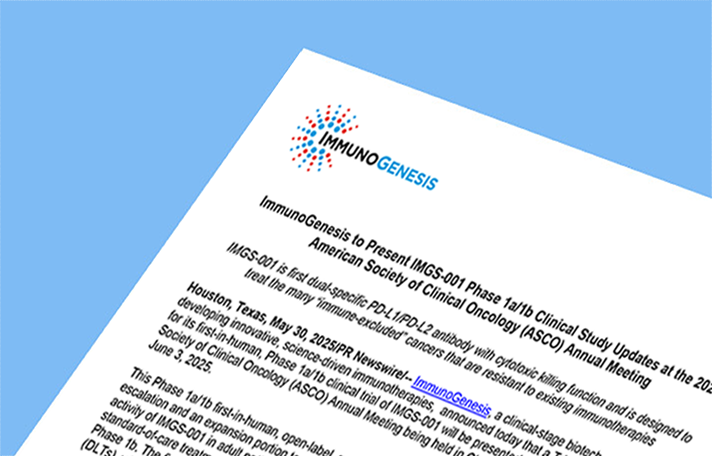 ImmunoGenesis to Present IMGS-001 Phase 1a/1b Clinical Study Updates at the 2025 American Society of Clinical Oncology (ASCO) Annual Meeting