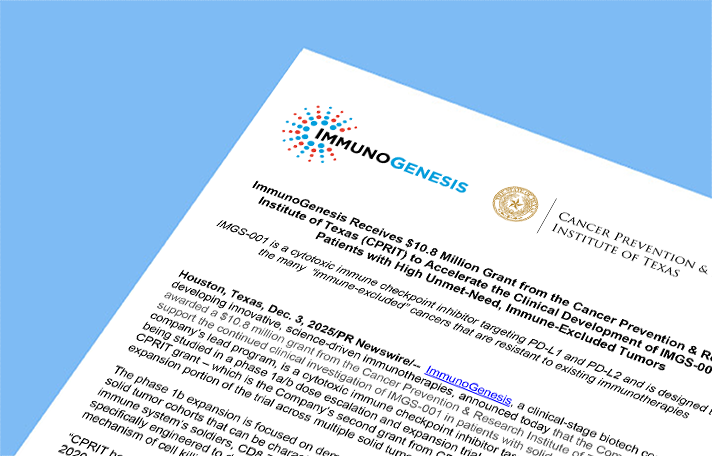 ImmunoGenesis Receives $10.8 Million Grant from the Cancer Prevention & Research Institute of Texas (CPRIT) to Accelerate the Clinical Development of IMGS-001 for Patients with Immune-Excluded Tumors with High Unmet Need