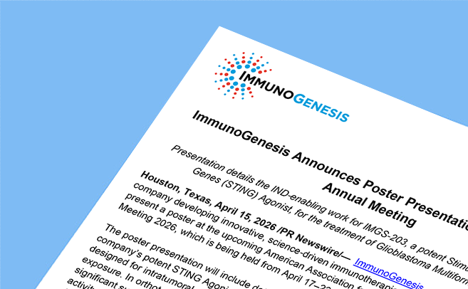 ImmunoGenesis, a clinical-stage biotech company developing innovative, science-driven immunotherapies, today announced that it will present a poster at the upcoming American Association for Cancer Research (AACR) Annual Meeting 2026, which is being held from April 17–22, 2026, in San Diego, CA.